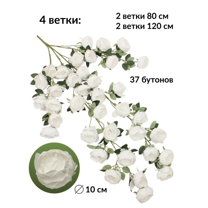 Цветы искуственные Пионы каскадные (37 штук, 120 см, цветок 10 см) белый 265452